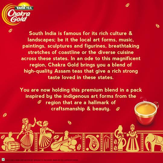 Tata presents Premium Gold Tea is sourced from the finest farms of India. Anytime can be tea time when you have Tata Tea Chakra Gold by your side! South India is famous for its rich culture & landscapes, be it the local art forms, music, paintings, sculptures and figurines, breathtaking stretches of coastline or the diverse cuisine across these states. In an ode to this magnificent region, Chakra Gold brings you a blend of high-quality Assam teas that give a strong taste loved in these state.