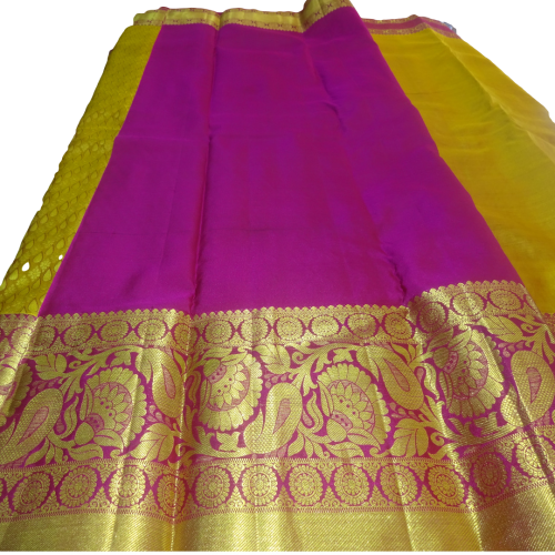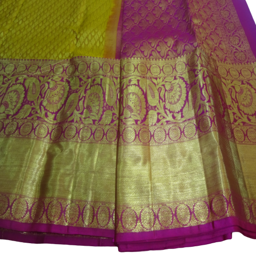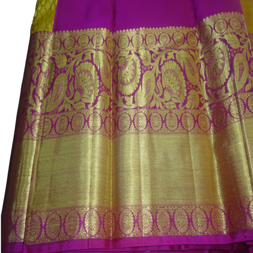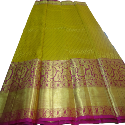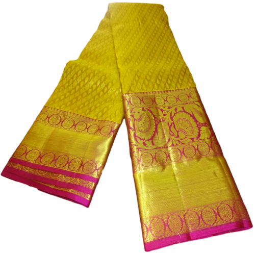 Beautiful Heavy Kanchi Silk Broket Golden Yellow Pattu Saree with Rose Border