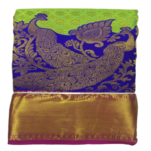 Beautiful Ethenic Kanchi Broket ParrotGreen Silk Saree with Rose and Violet Peacock Border