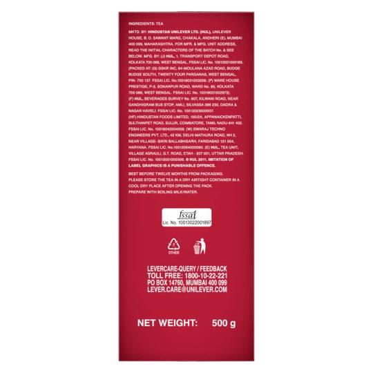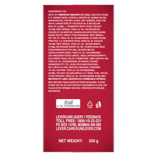 Red Label Leaf Tea is your best bet to start your mornings. It is made from the finest quality of tea leaves and has a strong aroma to make a perfect cup of tea.High quality blend of tea rich in taste.Taste of togetherness.Processed in the unique Brooke Bond Tea Excellence Center.The taste of Brooke Bond Red Label tea helps you spread warmth and cheer in your family.Understanding your need for uncompromising consistent quality to delight your senses.