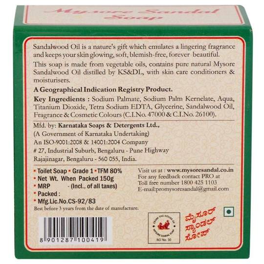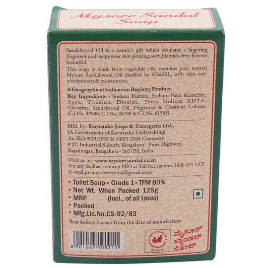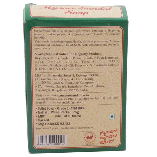 Mysore Sandal Soap made from vegetable oils, contains pure natural Mysore sandalwood oil, along with skin care conditioners &moisturizers. Sandalwood oil- a nature’s gift, emanates lingering fragrance, keeps your skin glowing, soft, blemish-free, forever young & beautiful.