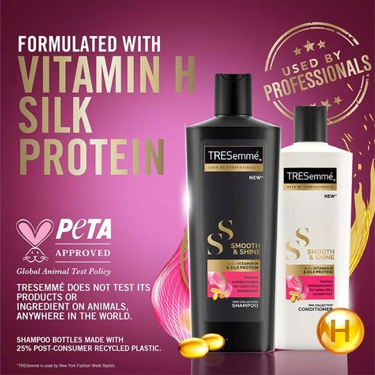 TRESemm Smooth Shine Shampoo provides intense moisturization to your hair giving you salon silky smooth hair. Enriched with Vitamin H and Silk Protein, this professional shampoo has patented micro-moisture technology that protects dry hair from damage. Vitamin H which is also known as Biotin plays an important role in maintaining the health of your hair while Silk Protein helps in moisturizing hair and improving its elasticity.