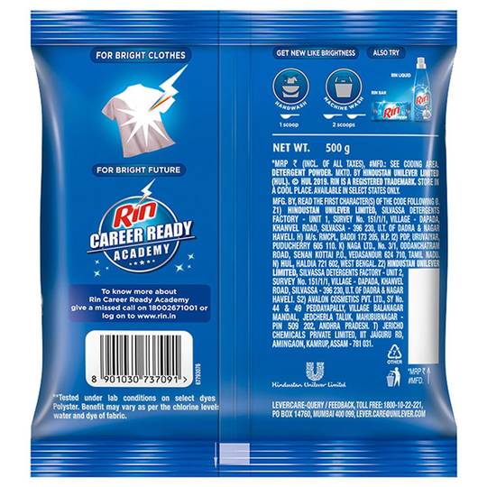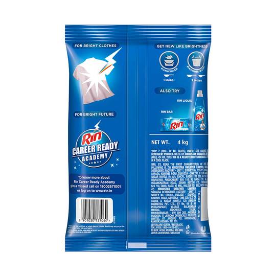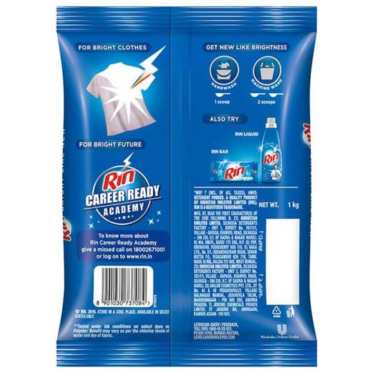 Rin Detergent Powder is the first product extension from the iconic brand that stands for whiteness in laundry. Sparkling bright clothes not only help with great impressions but also provide confidence to realize one's ambitions. Rin, with its patented bright clean technology, retains the shine of your white and coloured clothes wash after wash. So go ahead and buy this product online today!!